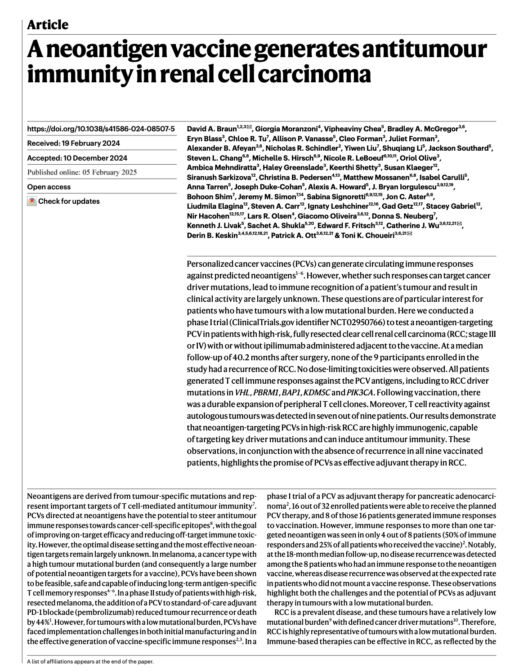 Rak nerkowokomórkowy jasnokomórkowy (ccRCC) to agresywny nowotwór z wysokim ryzykiem nawrotu nawet po leczeniu chirurgicznym. Ostatnie badania nad spersonalizowanymi szczepionkami przeciwnowotworowymi, takimi jak szczepionka NeoVax, przyniosły obiecujące wyniki w badaniu fazy 1, wykazując 100% wskaźnik braku nawrotu u pacjentów z ccRCC w stadium III i IV. Jednakże, aby w pełni wykorzystać potencjał tych szczepionek, konieczne jest dalsze zbadanie mechanizmów odpornościowych, identyfikacja biomarkerów predykcyjnych i optymalizacja strategii wzmacniania skuteczności klinicznej.